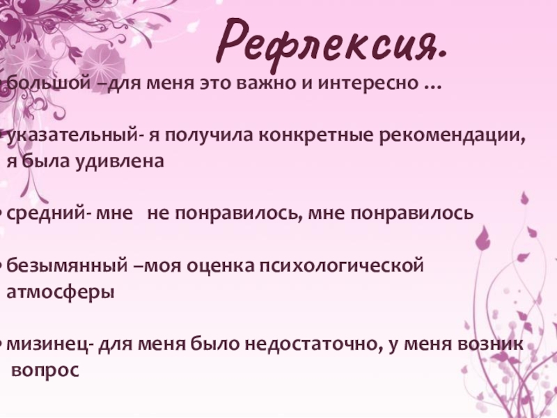 Рефлексия.большой –для меня это важно и интересно … указательный- я получила конкретные рекомендации, я была удивленасредний- мне