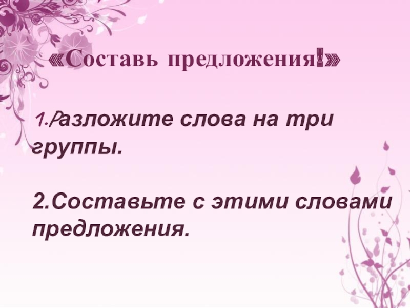 Слайд 3 «Составь предложения!» 1.Разложите слова на три группы. 2.Составьте с этими словами предложения.