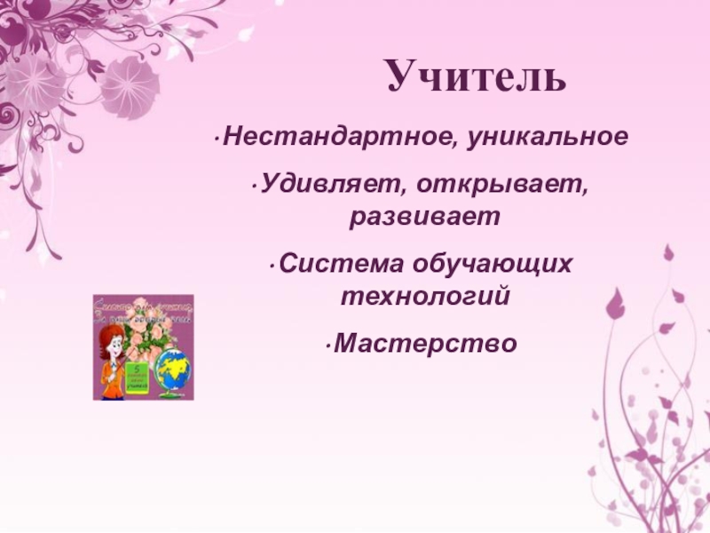УчительНестандартное, уникальноеУдивляет, открывает, развиваетСистема обучающих технологийМастерство