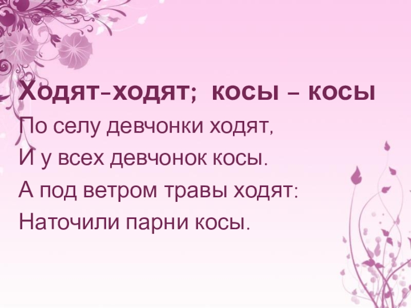 Ходят-ходят; косы – косыПо селу девчонки ходят,И у всех девчонок косы.А под ветром травы ходят:Наточили парни косы.