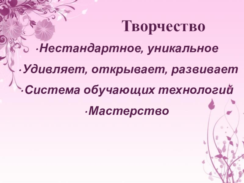 Творчество Нестандартное, уникальноеУдивляет, открывает, развиваетСистема обучающих технологийМастерство