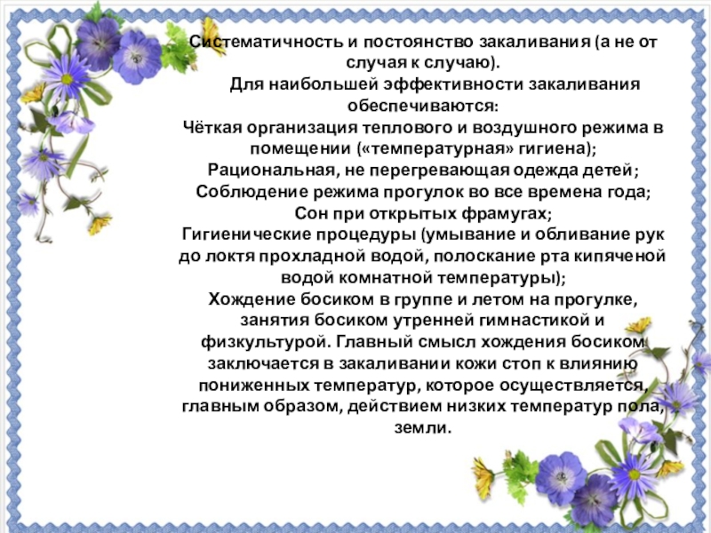Слайд 10Систематичность и постоянство закаливания (а не от случая к случаю).