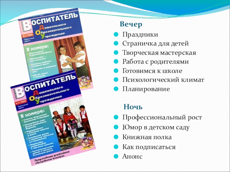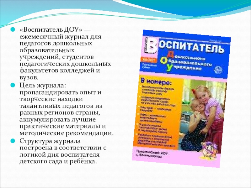 Слайд 7Журнал «Воспитатель ДОУ» - это принципиально новый журнал для воспитателей ДОУ, структура