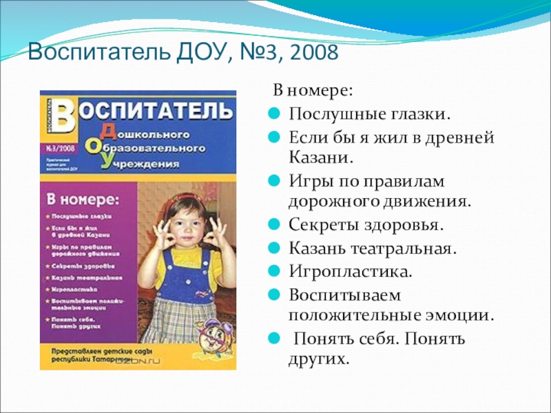 Воспитатель ДОУ, №3, 2008 В номере: Послушные глазки. Если бы я жил в древней Казани.Игры по правилам