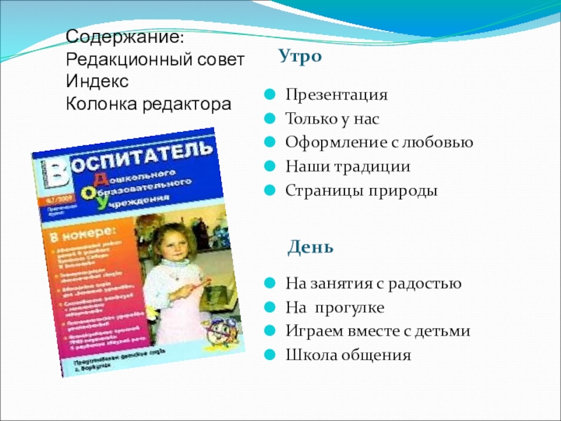 Содержание:  Редакционный совет Индекс Колонка редактораУтроДеньПрезентацияТолько у насОформление с любовьюНаши традицииСтраницы природыНа занятия с радостьюНа прогулкеИграем