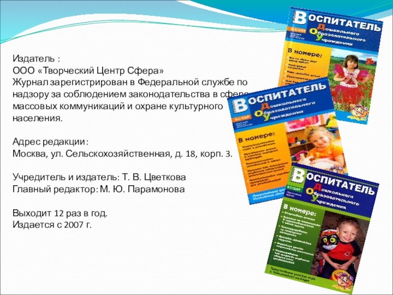 Слайд 2 Издатель : ООО «Творческий Центр Сфера» Журнал зарегистрирован в Федеральной службе по надзору