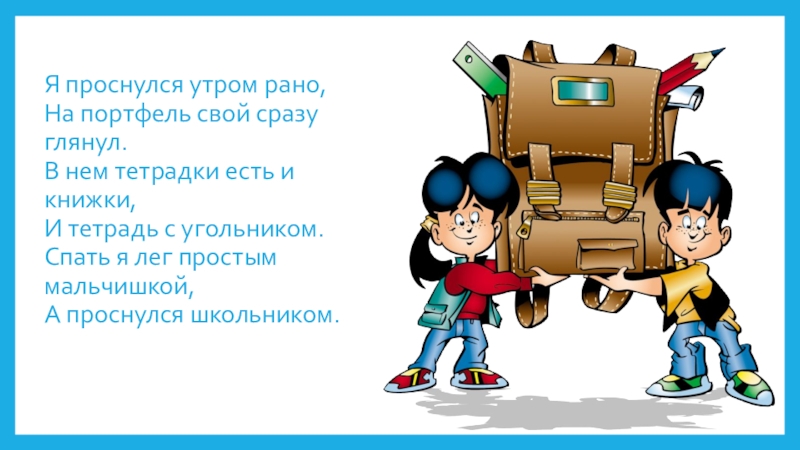 Я проснулся утром рано, На портфель свой сразу глянул. В нем тетрадки есть и книжки, И тетрадь с угольником. Спать я лег простым мальчишкой, А проснулся школьником.