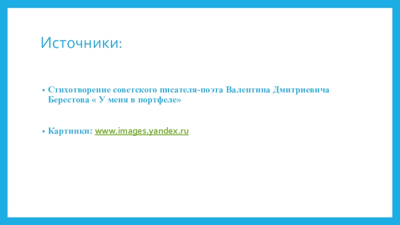 Источники:Стихотворение советского писателя-поэта Валентина Дмитриевича Берестова « У меня в портфеле»Картинки: www.images.yandex.ru