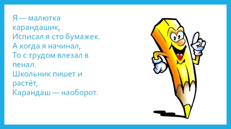 Я — малютка карандашик, Исписал я сто бумажек. А когда я начинал, То с трудом влезал в