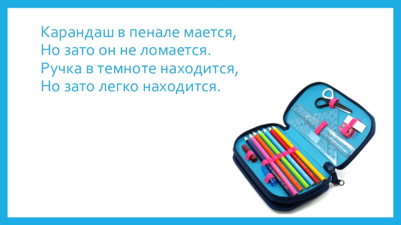 Карандаш в пенале мается, Но зато он не ломается. Ручка в темноте находится, Но зато легко находится.