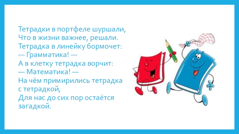 Грамматика! — А в клетку тетрадка ворчит: — Математика! — На чём примирились тетрадка с тетрадкой, Для нас до сих пор остаётся загадкой.