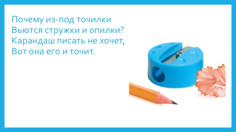Слайд 5Почему из-под точилки Вьются стружки и опилки? Карандаш писать не хочет, Вот она