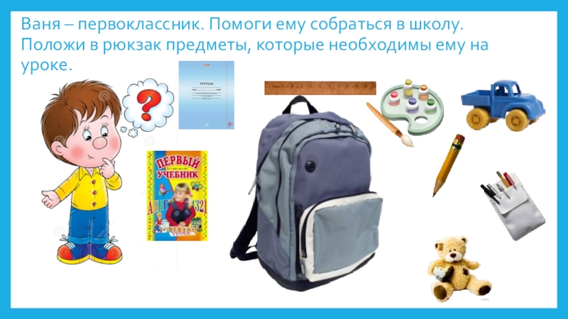 Слайд 15Ваня – первоклассник. Помоги ему собраться в школу. Положи в рюкзак