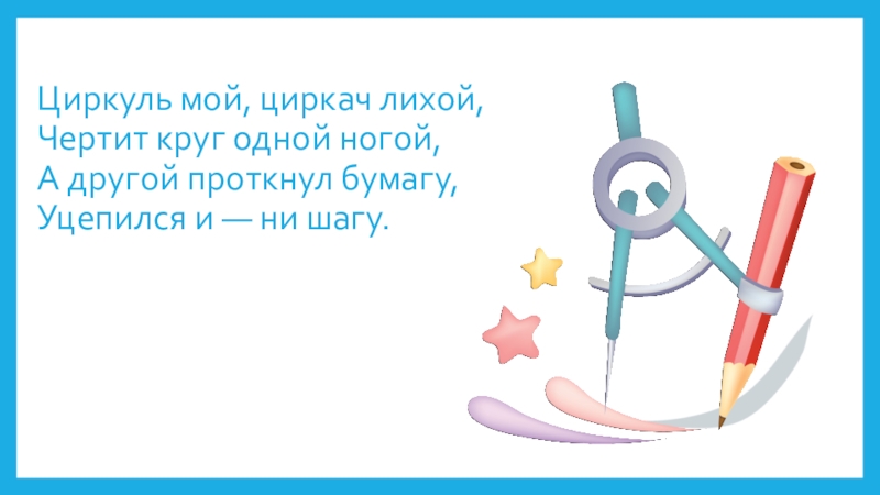 Слайд 13Циркуль мой, циркач лихой, Чертит круг одной ногой, А другой проткнул бумагу, Уцепился и