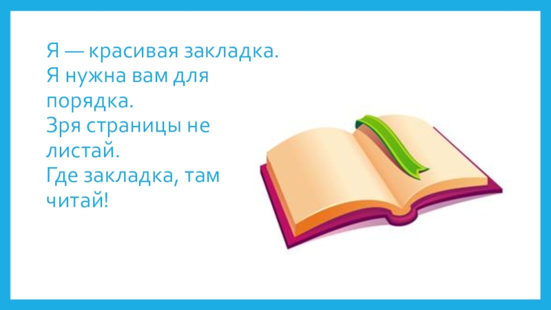 Я — красивая закладка. Я нужна вам для порядка. Зря страницы не листай. Где закладка, там читай!