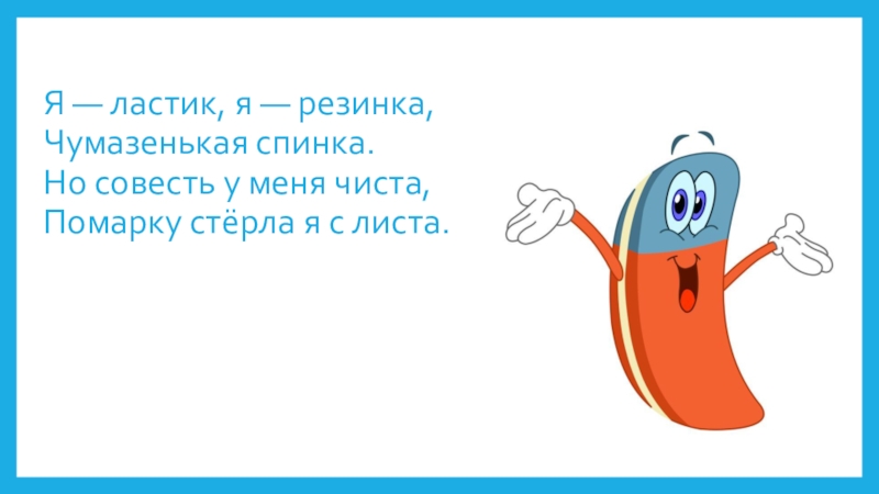 Я — ластик, я — резинка, Чумазенькая спинка. Но совесть у меня чиста,  Помарку стёрла я