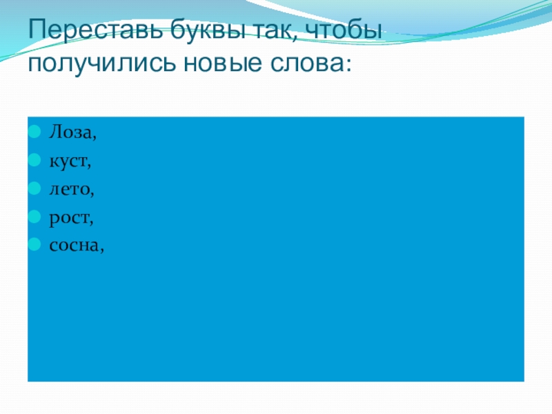 Слайд 19Переставь буквы так, чтобы получились новые слова: