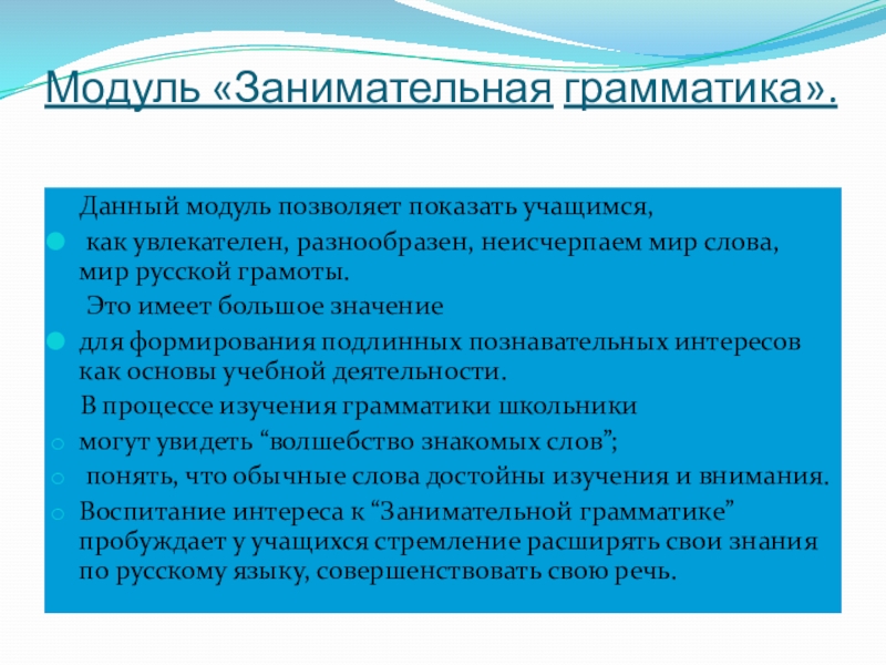 Воспитание интереса к “Занимательной грамматике” пробуждает у учащихся стремление расширять свои знания по русскому языку, совершенствовать свою речь.