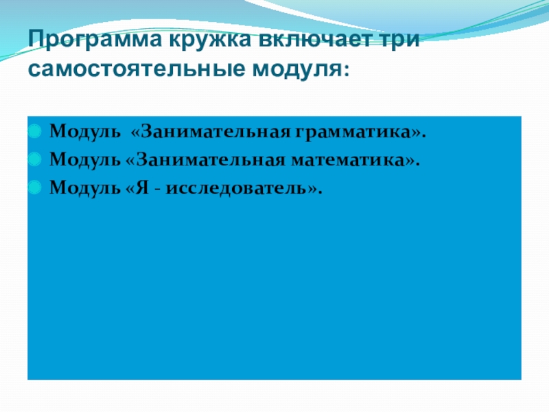 Слайд 5Программа кружка включает три самостоятельные модуля: