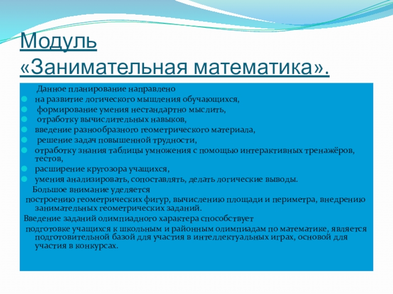 построению геометрических фигур, вычислению площади и периметра, внедрению занимательных геометрических заданий.