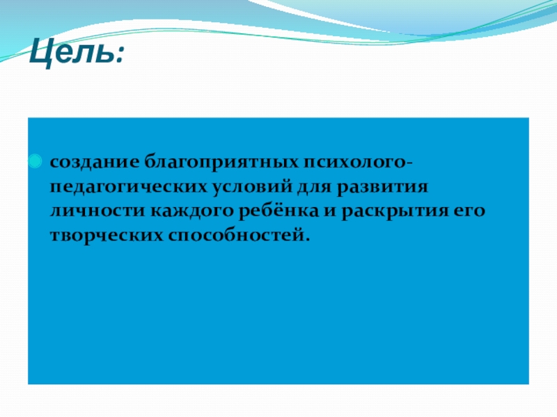 создание благоприятных психолого-педагогических условий для развития личности каждого ребёнка и раскрытия его творческих способностей.