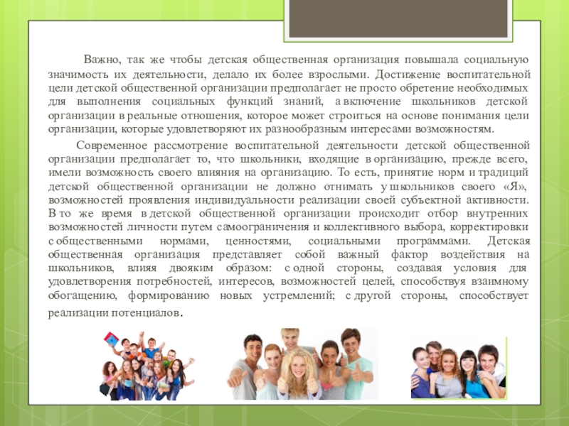 Слайд 5 Важно, так же чтобы детская общественная организация повышала социальную значимость