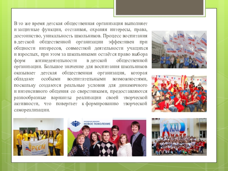 Слайд 6В то же время детская общественная организация выполняет и защитные функции, отстаивая, охраняя