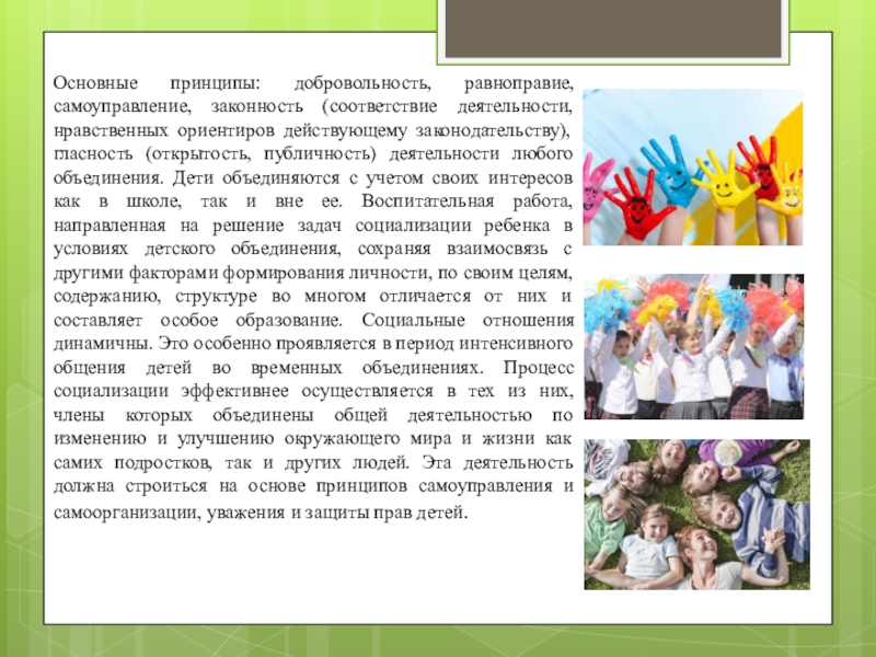 Дети объединяются с учетом своих интересов как в школе, так и вне ее. Воспитательная работа, направленная на решение задач социализации ребенка в условиях детского объединения, сохраняя взаимосвязь с другими факторами формирования личности, по своим целям, содержанию, структуре во многом отличается от них и составляет особое образование. Социальные отношения динамичны. Это особенно проявляется в период интенсивного общения детей во временных объединениях. Процесс социализации эффективнее осуществляется в тех из них, члены которых объединены общей деятельностью по изменению и улучшению окружающего мира и жизни как самих подростков, так и других людей. Эта деятельность должна строиться на основе принципов самоуправления и самоорганизации, уважения и защиты прав детей.