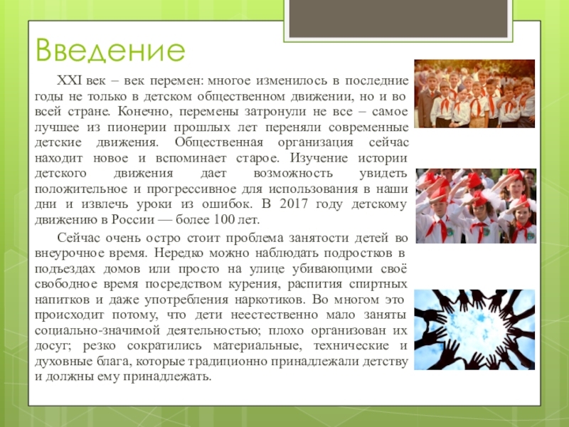 детском общественном движении, но и во всей стране. Конечно, перемены затронули не все – самое лучшее из пионерии прошлых лет переняли современные детские движения. Общественная организация сейчас находит новое и вспоминает старое. Изучение истории детского движения дает возможность увидеть положительное и прогрессивное для использования в наши дни и извлечь уроки из ошибок. В 2017 году детскому движению в России — более 100 лет.
