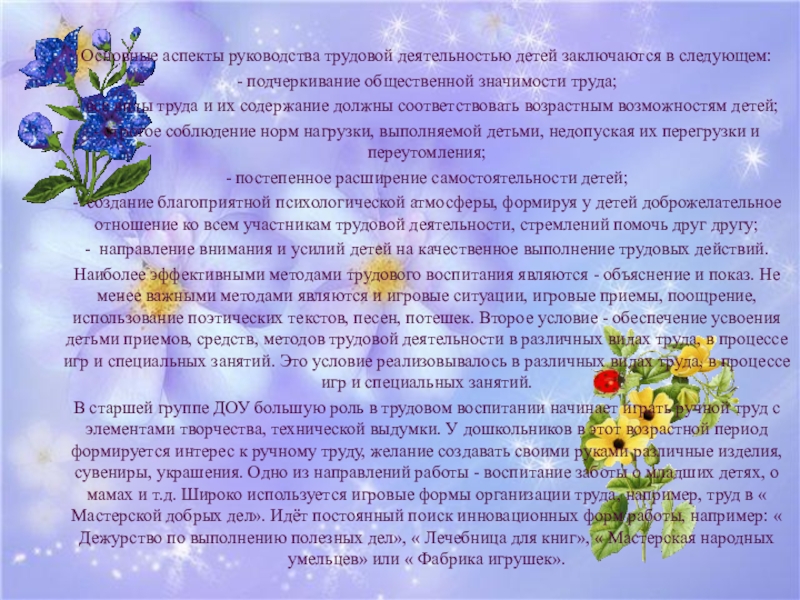 Основные аспекты руководства трудовой деятельностью детей заключаются в следующем:
