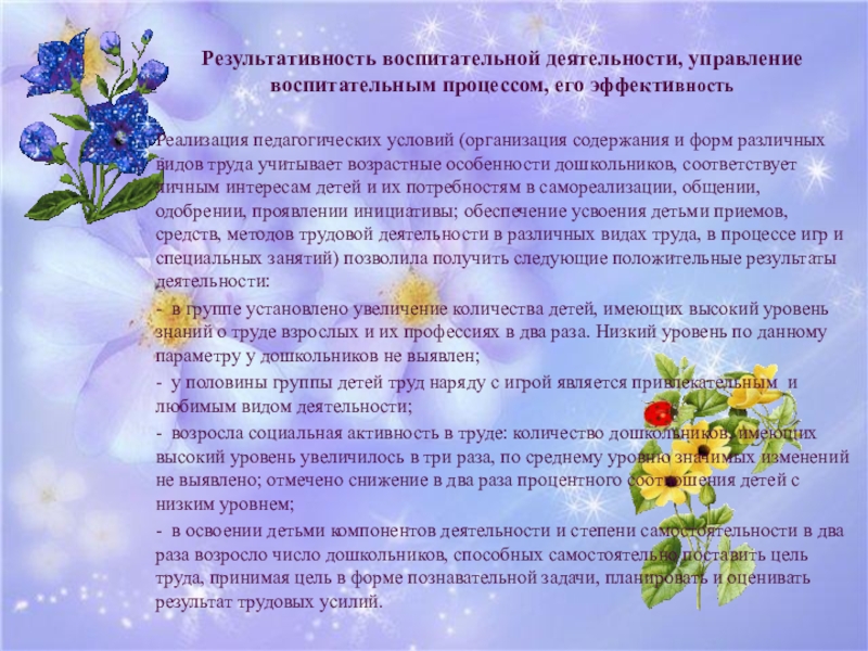 содержания и форм различных видов труда учитывает возрастные особенности дошкольников, соответствует личным интересам детей и их потребностям в самореализации, общении, одобрении, проявлении инициативы; обеспечение усвоения детьми приемов, средств, методов трудовой деятельности в различных видах труда, в процессе игр и специальных занятий) позволила получить следующие положительные результаты деятельности: