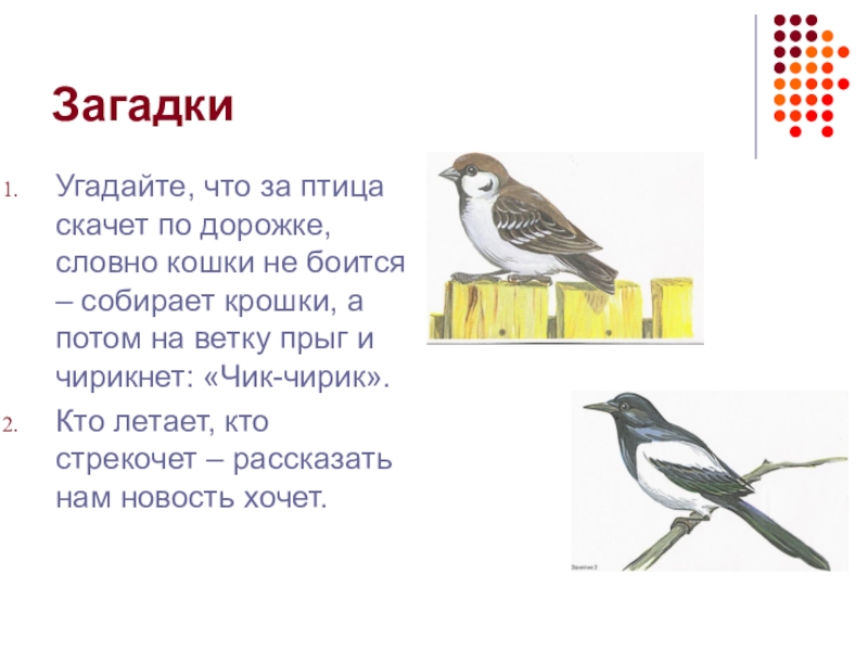 Загадки Угадайте, что за птица скачет по дорожке, словно кошки не боится – собирает крошки, а потом