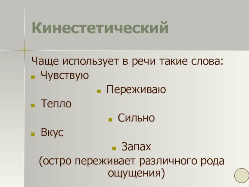 Кинестетический Чаще использует в речи такие слова:ЧувствуюПереживаюТеплоСильноВкусЗапах(остро переживает различного рода ощущения)