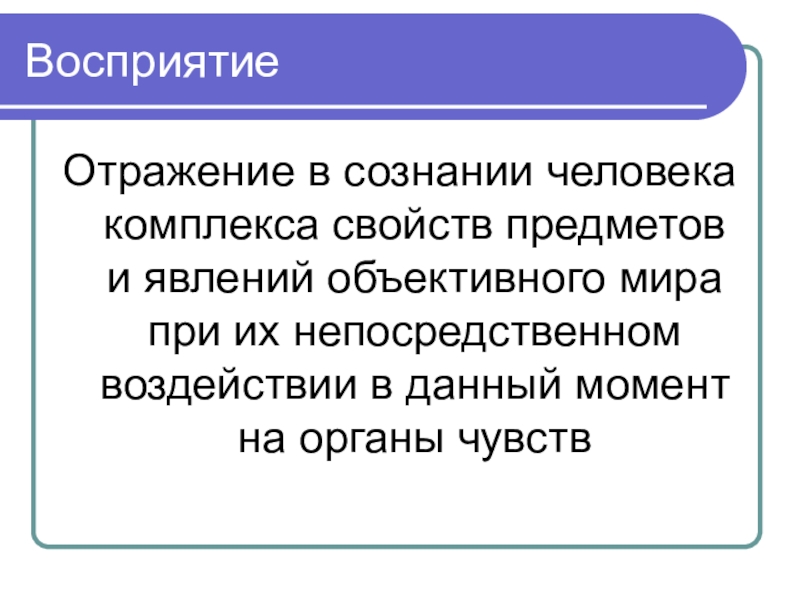 ВосприятиеОтражение в сознании человека комплекса свойств предметов и явлений объективного мира при их непосредственном воздействии в данный