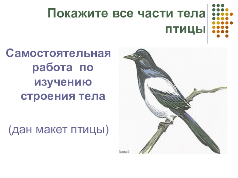 Покажите все части тела птицыСамостоятельная работа по изучению строения тела(дан макет птицы)