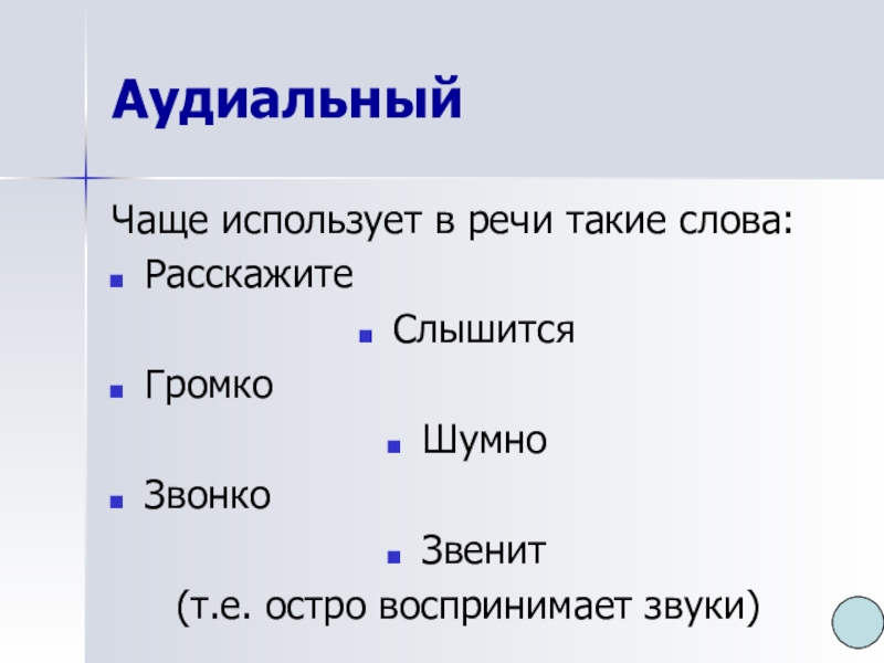 Аудиальный Чаще использует в речи такие слова:РасскажитеСлышитсяГромкоШумноЗвонкоЗвенит(т.е. остро воспринимает звуки)
