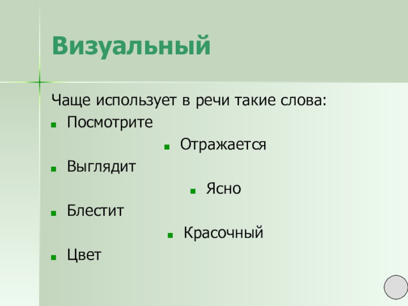 Визуальный Чаще использует в речи такие слова:ПосмотритеОтражаетсяВыглядитЯсноБлеститКрасочныйЦвет