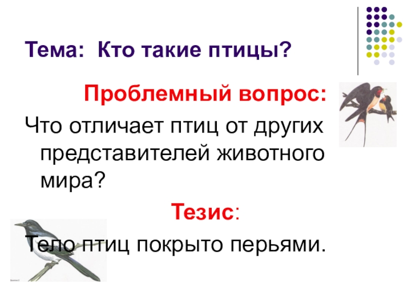 Тема: Кто такие птицы?Проблемный вопрос:Что отличает птиц от других представителей животного мира?Тезис:Тело птиц покрыто перьями.