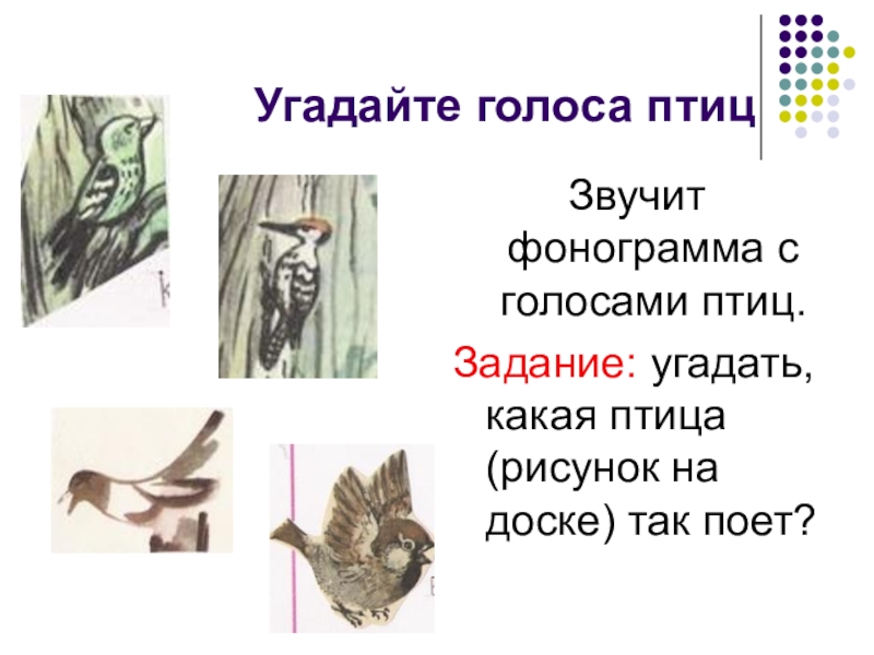 Угадайте голоса птицЗвучит фонограмма с голосами птиц.Задание: угадать, какая птица (рисунок на доске) так поет?