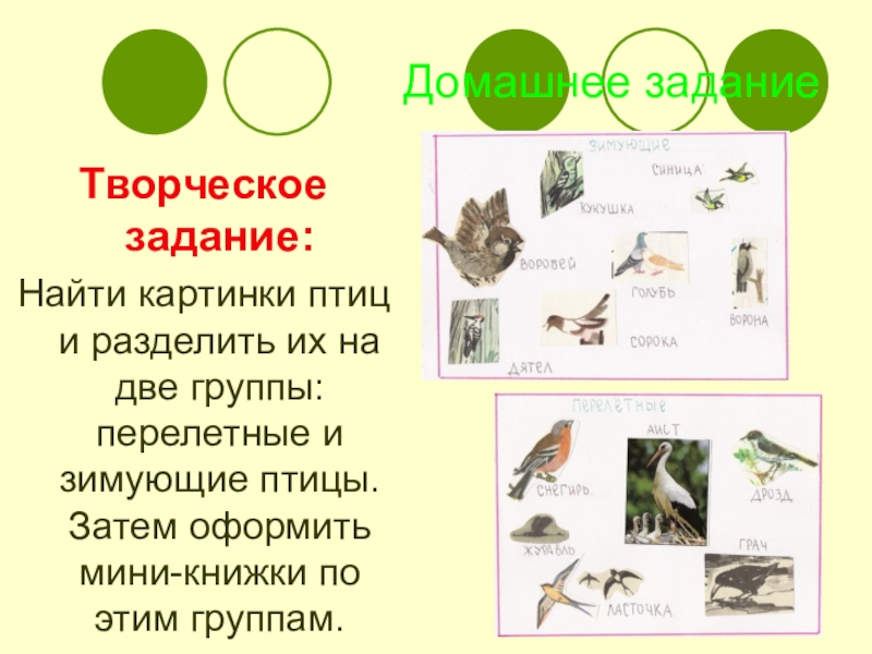 Домашнее заданиеТворческое задание:Найти картинки птиц и разделить их на две группы: перелетные и зимующие птицы. Затем оформить
