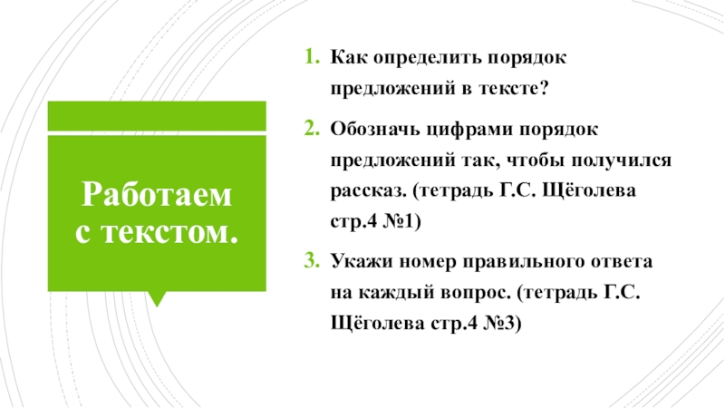 Работаем  с текстом.Как определить порядок предложений в тексте?Обозначь цифрами порядок предложений так, чтобы получился рассказ. (тетрадь