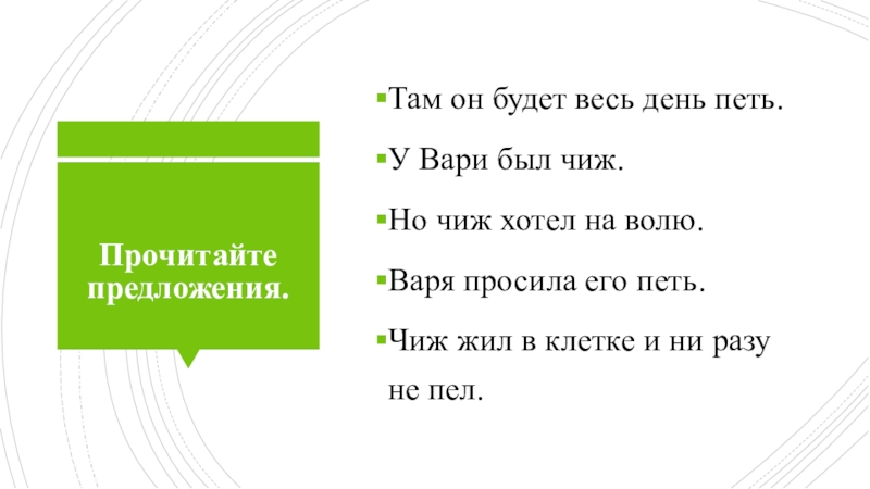 Прочитайте предложения.Там он будет весь день петь.У Вари был чиж.Но чиж хотел на волю.Варя просила его