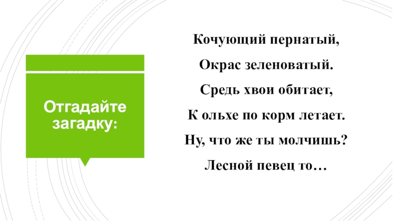 Отгадайте загадку:Кочующий пернатый,Окрас зеленоватый.Средь хвои обитает,К ольхе по корм летает.Ну, что же ты молчишь?Лесной певец то…
