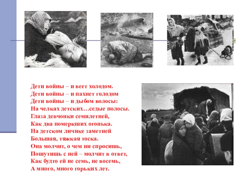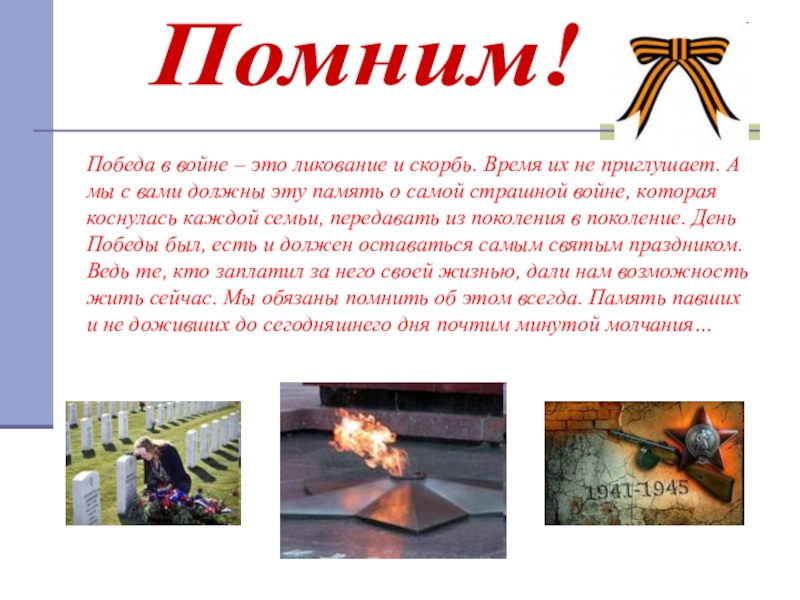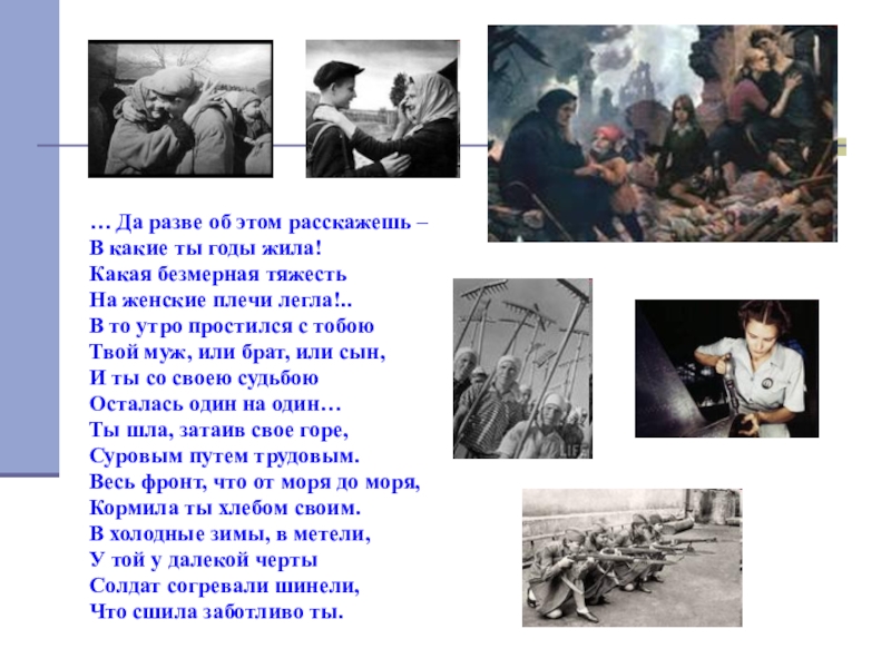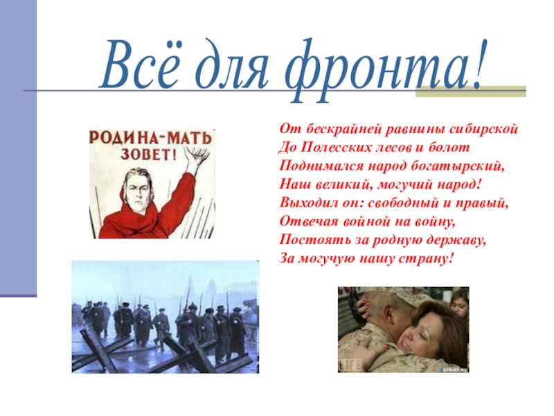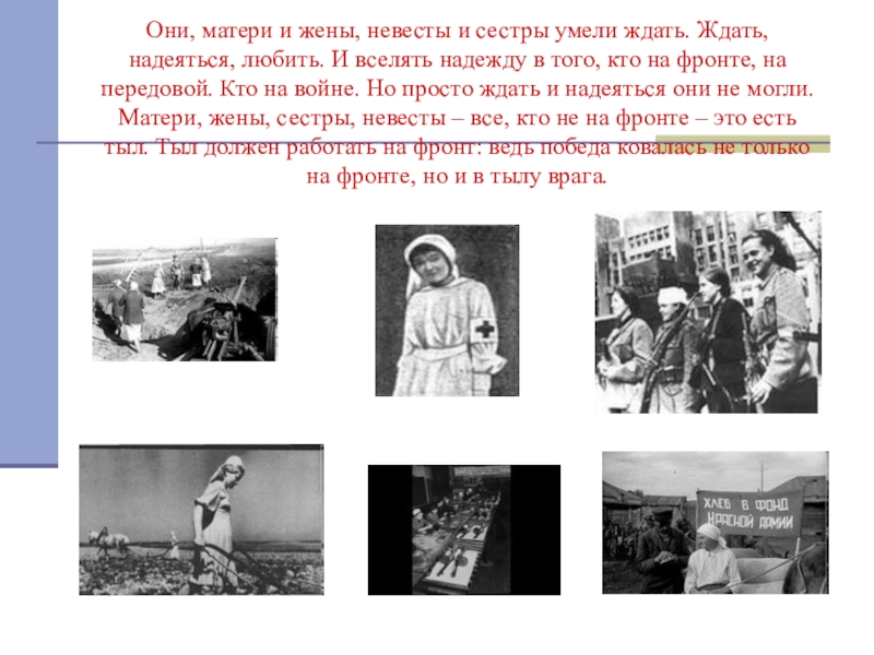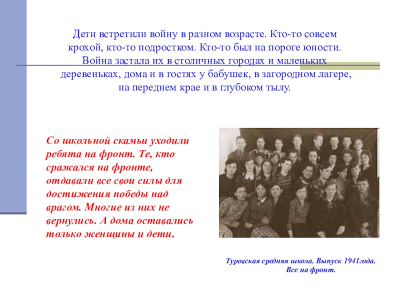 Со школьной скамьи уходили ребята на фронт. Те, кто сражался на фронте, отдавали все свои силы для достижения победы над врагом. Многие из них не вернулись. А дома оставались только женщины и дети.