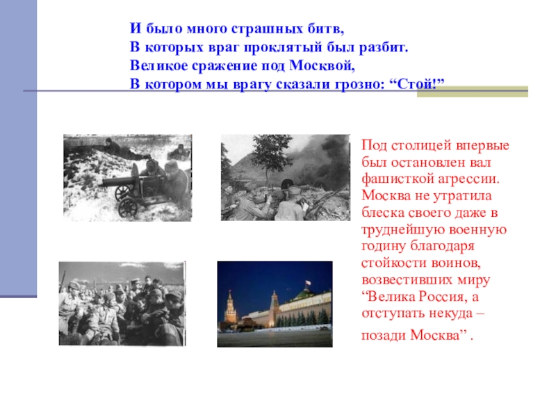 Под столицей впервые был остановлен вал фашисткой агрессии. Москва не утратила блеска своего даже в труднейшую военную годину благодаря стойкости воинов, возвестивших миру “Велика Россия, а отступать некуда – позади Москва” .