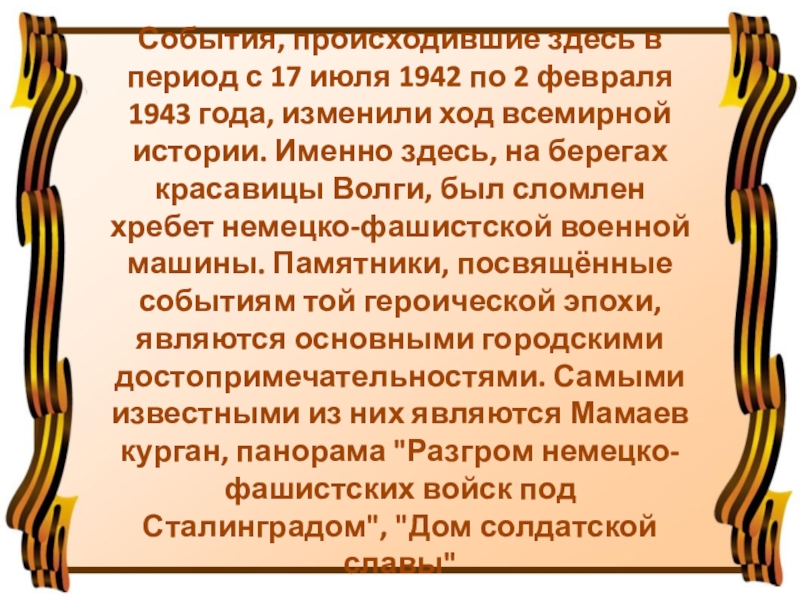 февраля 1943 года, изменили ход всемирной истории. Именно здесь, на берегах красавицы Волги, был сломлен хребет немецко-фашистской военной машины. Памятники, посвящённые событиям той героической эпохи, являются основными городскими достопримечательностями. Самыми известными из них являются Мамаев курган, панорама "Разгром немецко-фашистских войск под Сталинградом", "Дом солдатской славы"