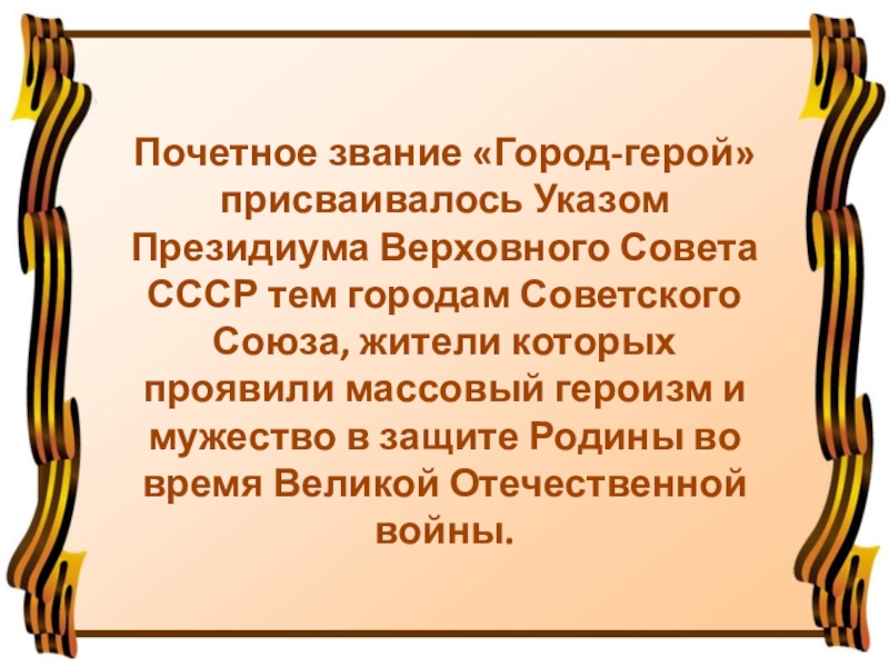 Слайд 2Почетное звание «Город-герой» присваивалось Указом Президиума Верховного Совета СССР тем городам