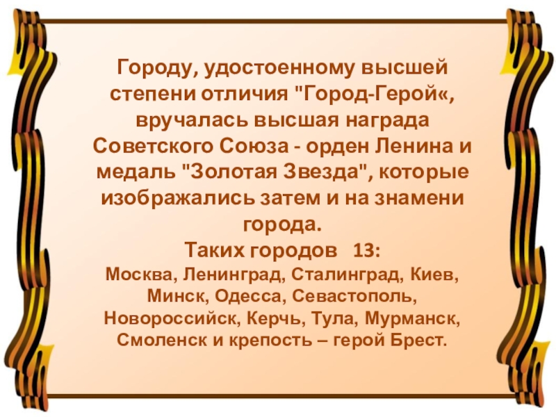 Слайд 3Городу, удостоенному высшей степени отличия "Город-Герой«, вручалась высшая награда Советского Союза