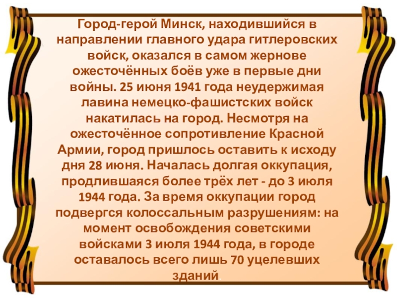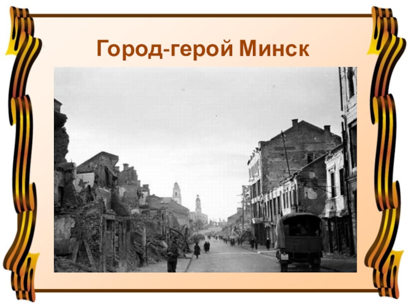 Слайд 13Город-герой Минск, находившийся в направлении главного удара гитлеровских войск, оказался в