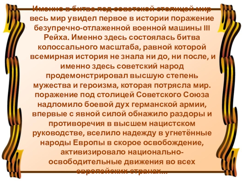 в истории поражение безупречно-отлаженной военной машины III Рейха. Именно здесь состоялась битва колоссального масштаба, равной которой всемирная история не знала ни до, ни после, и именно здесь советский народ продемонстрировал высшую степень мужества и героизма, которая потрясла мир. поражение под столицей Советского Союза надломило боевой дух германской армии, впервые с явной силой обнажило раздоры и противоречия в высшем нацистском руководстве, вселило надежду в угнетённые народы Европы в скорое освобождение, активизировало национально-освободительные движения во всех европейских странах...